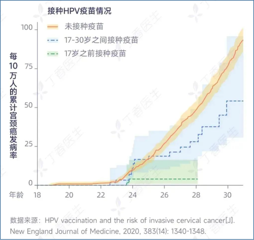 2020年,瑞典卡罗林斯卡医学院在 NEJM 上发表了《接种 HPV 疫苗与浸润性宫颈癌风险之间的关系》的论文,其研究结果也为社会公众提供了有力的证据。