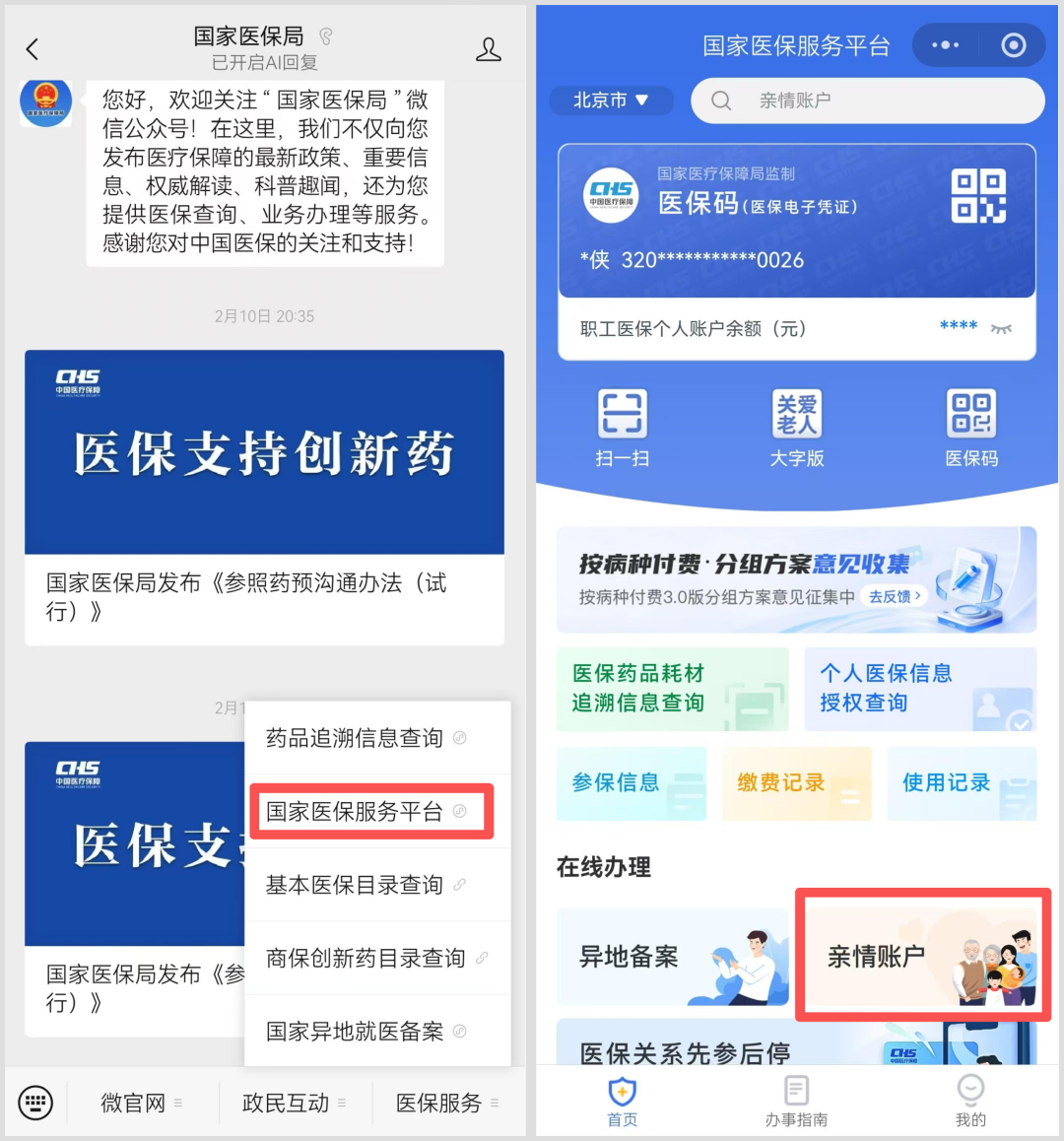 点击医保服务→国家医保服务平台,进入“亲情账户”操作页面
