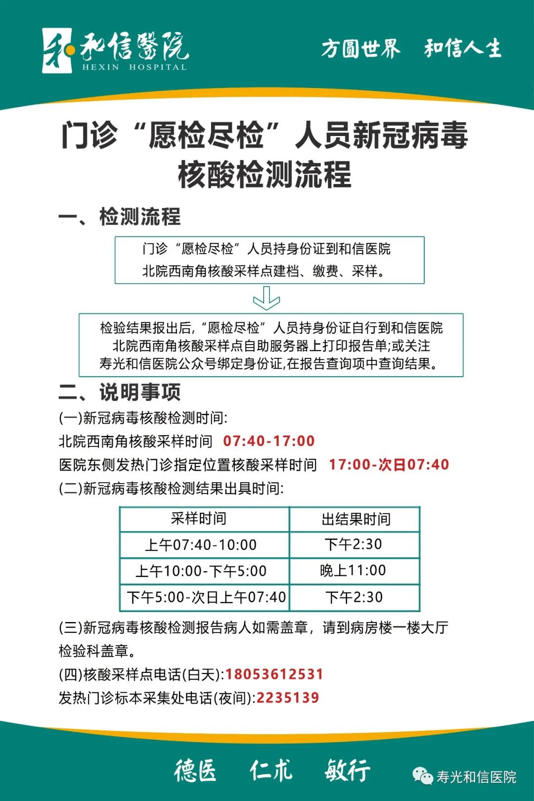 寿光和信医院门诊“愿检尽检”人员新冠病毒核酸检测流程