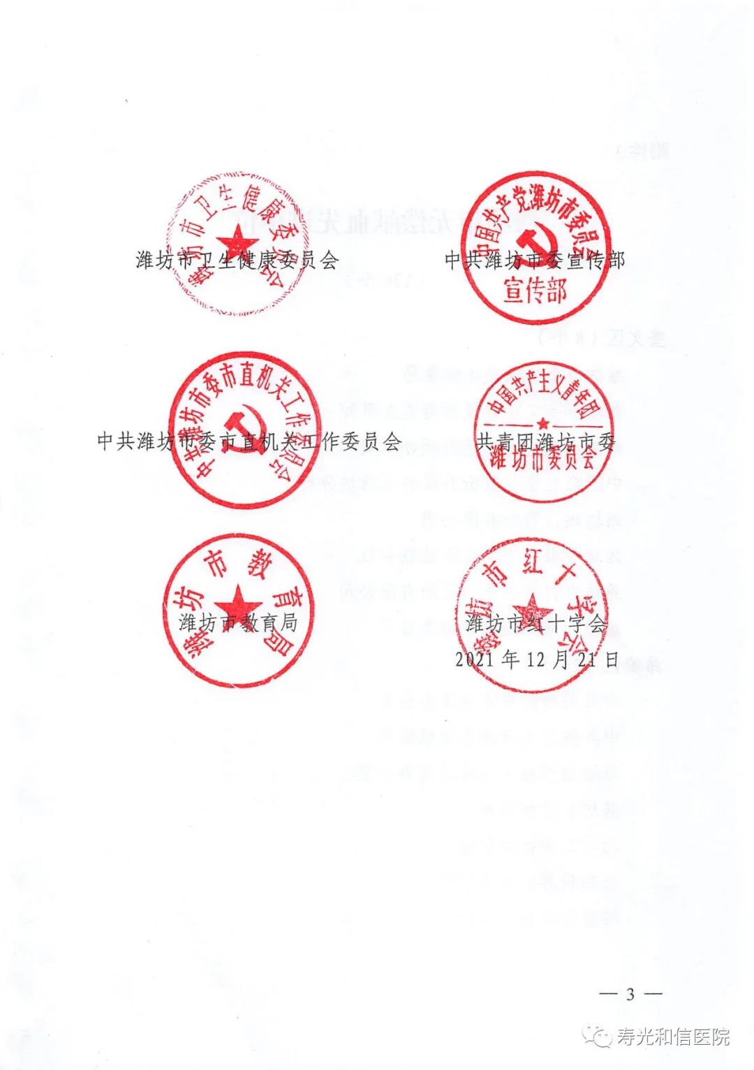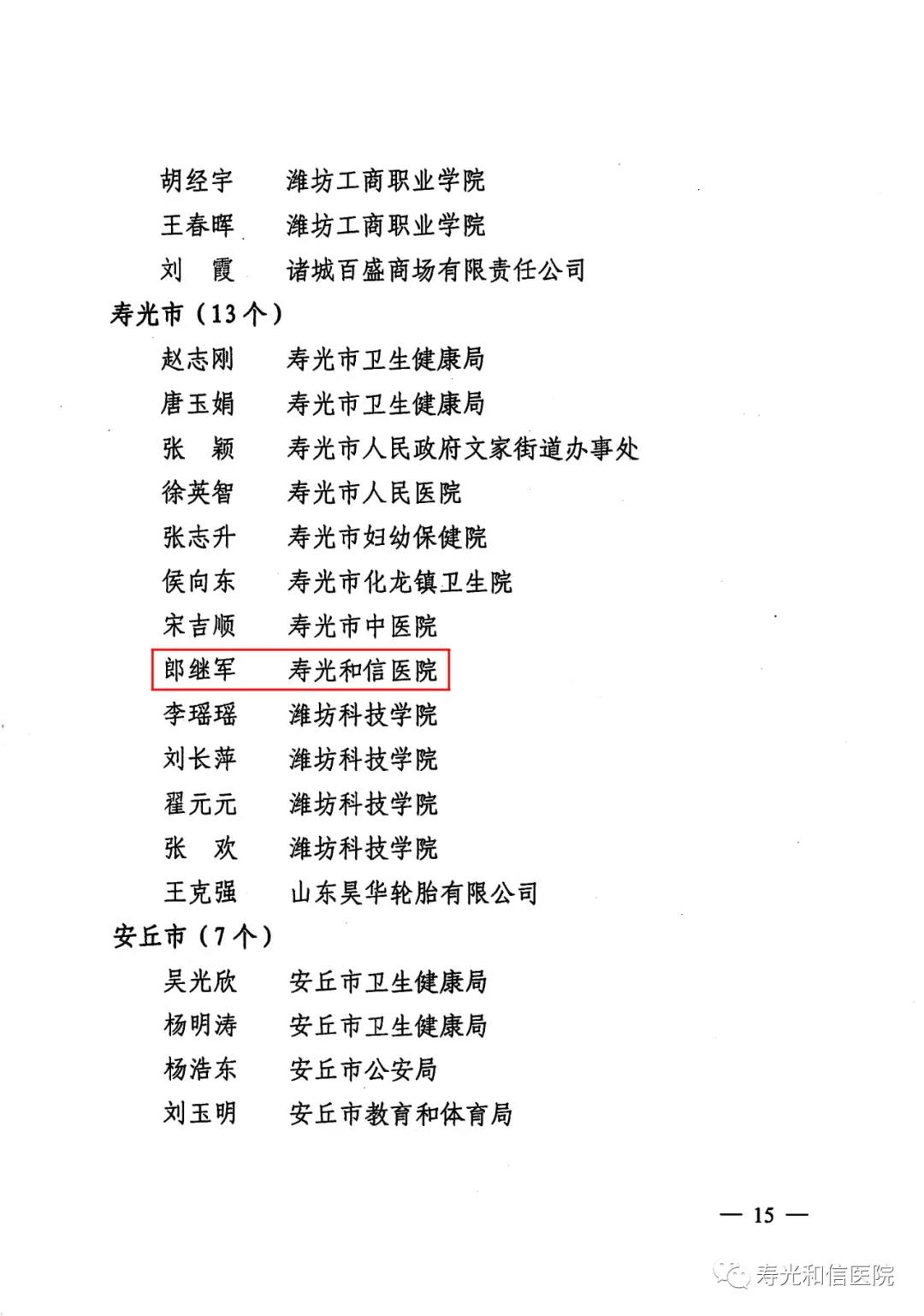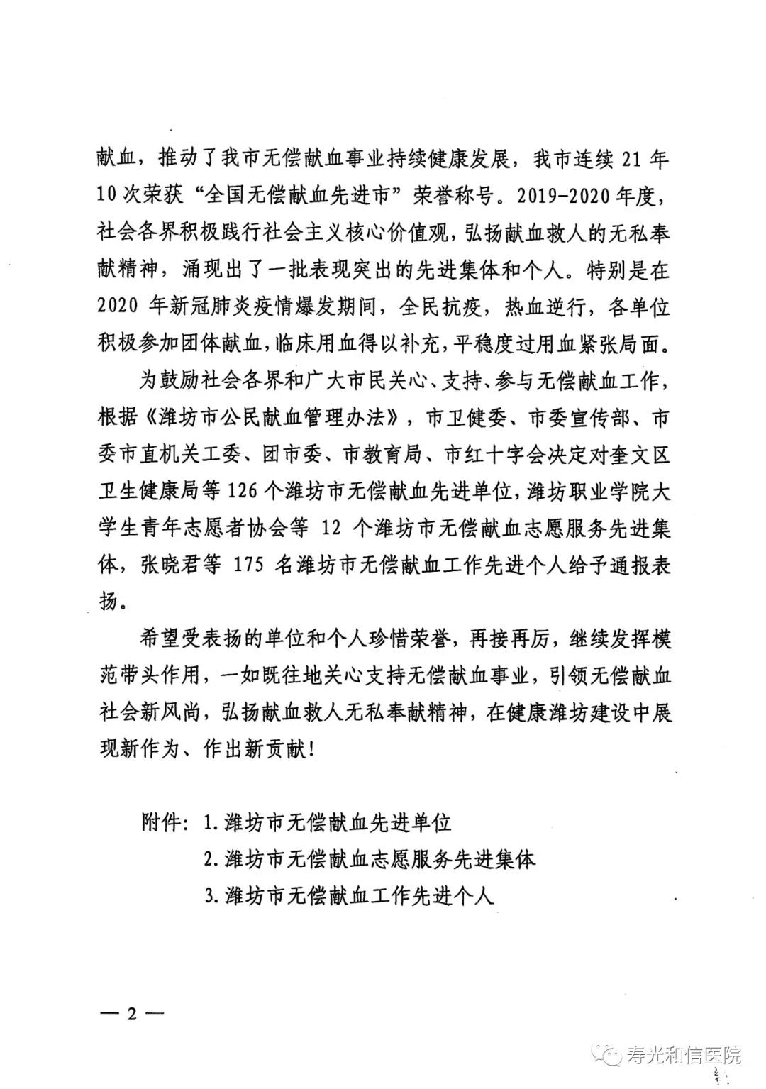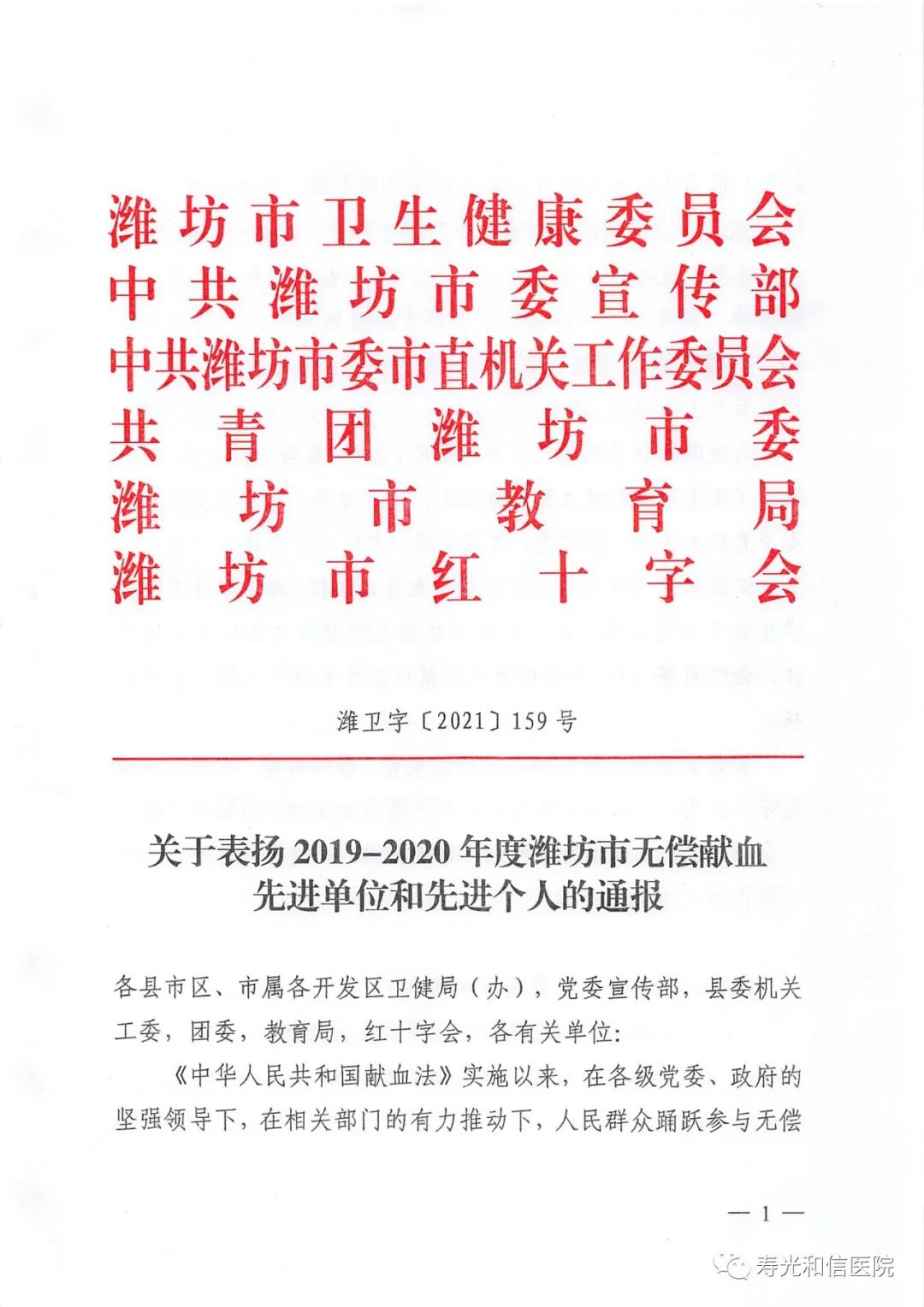 12月21日,潍坊市卫健委、中共潍坊市委宣传部、共青团潍坊市委、潍坊市红十字会等联合下发《关于表扬2019-2020年度潍坊市无偿献血先进单位和先进个人的通报》,寿光和信医院医务科主任郎继军作为无偿献血工作先进个人被通报表扬。