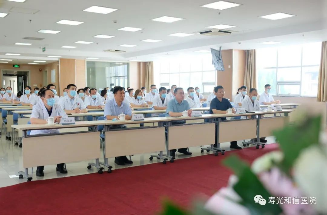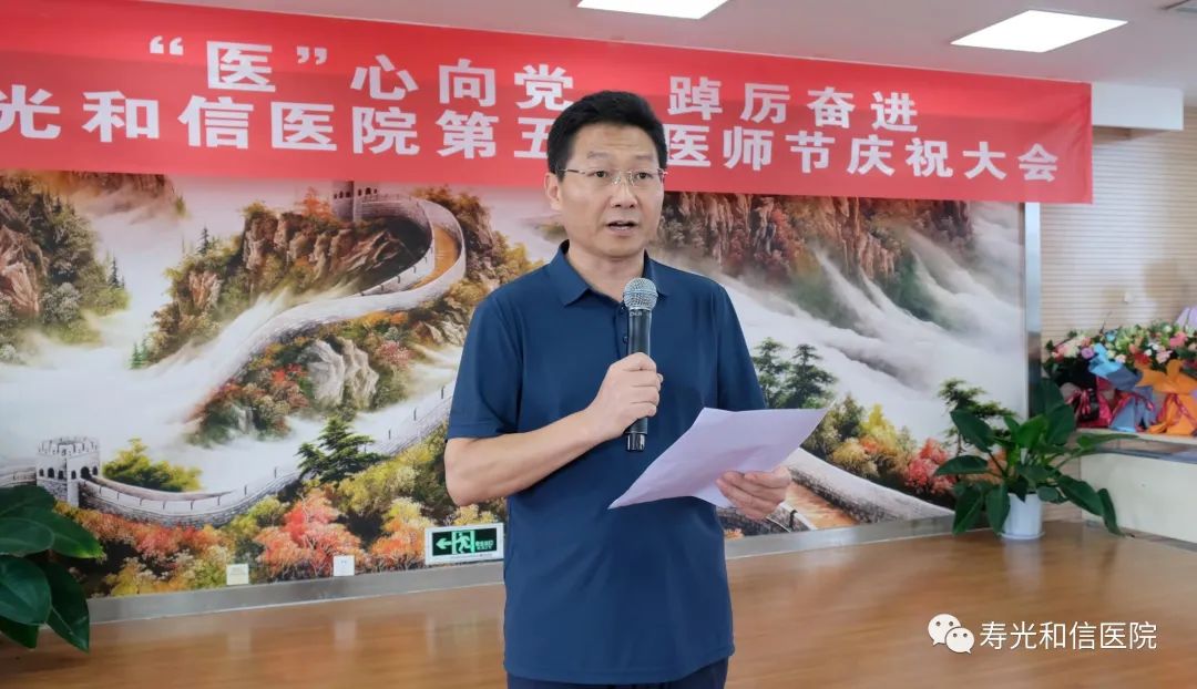 李群成局长宣读了《寿光市委、市政府致广大医师的慰问信》,并向和信医院全体医务人员送上节日的问候。他表示,寿光和信医院的工作已经融入到全市整体医疗工作中,特别在疫情防控期间,广大医务工作者冲锋在前,积极完成了上级交办的任务。此外,牵头成立了单病种群体管理新型服务联盟,促进了三家乡镇医院医疗技术水平的提高。希望全体职工团结一致,心往一处想,劲往一处使,把和信医院打造成为全市社会办医战线的一面旗帜。