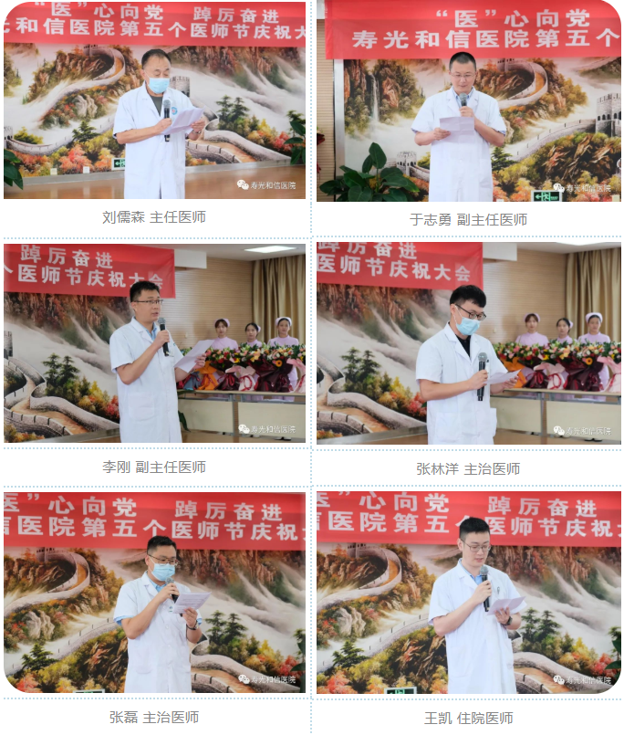 主任医师刘儒森,副主任医师于志勇、李刚,主治医师张林洋、张磊,住院医师王凯作为代表,先后发言。大家畅谈了医师节的感想,表达了牢记医师职责,珍惜今天的局面,“医”心向党,推动医院发展的信心和决心。