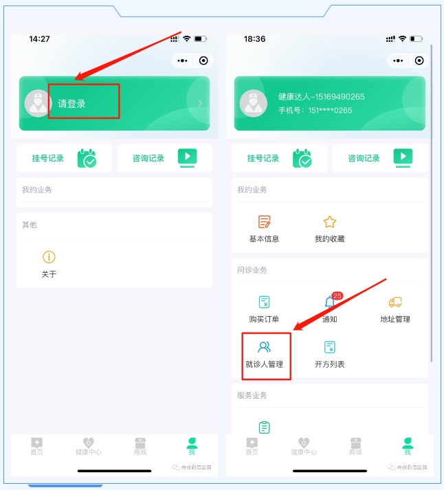 第三步:进入互联网医院界面后首先选择“我”进行登录并选择“就诊人管理”绑定授权本人电子健康卡。
