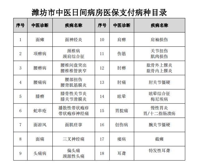 根据潍医保发[2023] 35号文件,经潍坊市医保局、卫健委批准,我院作为潍坊市中医日间病房试点医疗机构,积极响应医保惠民政策号召,“中医日间病房”于2024年1月1日正式落户中医康复科,旨在让广大参保者以更便捷的方式、更优惠的价格享受中医诊疗服务,让患者“不用住院也可享受住院报销”。