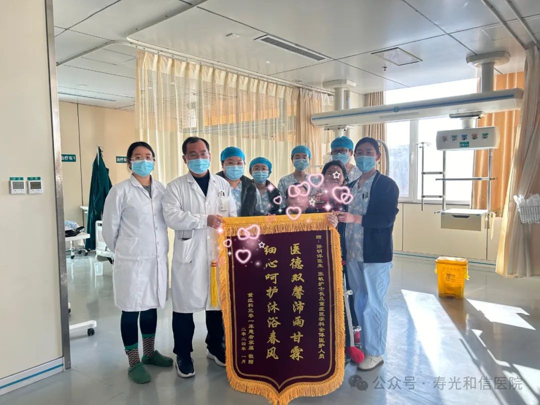经过一段时间的治疗和护理,病人终于从死亡线上挣扎回来。在生与死的边缘,医护人员没有放弃,用专业和爱心创造了生命的奇迹。2024年1月23日,病人家属将一面写有“医德双馨沛雨甘霖 细心呵护沐浴春风”的锦旗,赠送给全体医护人员,表达内心的感激与认可。