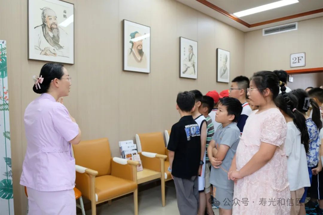 在中医康复科护士长范婷婷的带领下,大家顺着楼梯去往三楼,透过楼梯文化墙上中草药宣传画,看到了中草药本来的样子。“茯苓也是中药吗?”面对小记者的疑问,范婷婷护士长耐心为孩子们讲解了“药食同源”的传统医学知识,又详细介绍了中医名家生平及卓越贡献,和孩子们亲切互动。