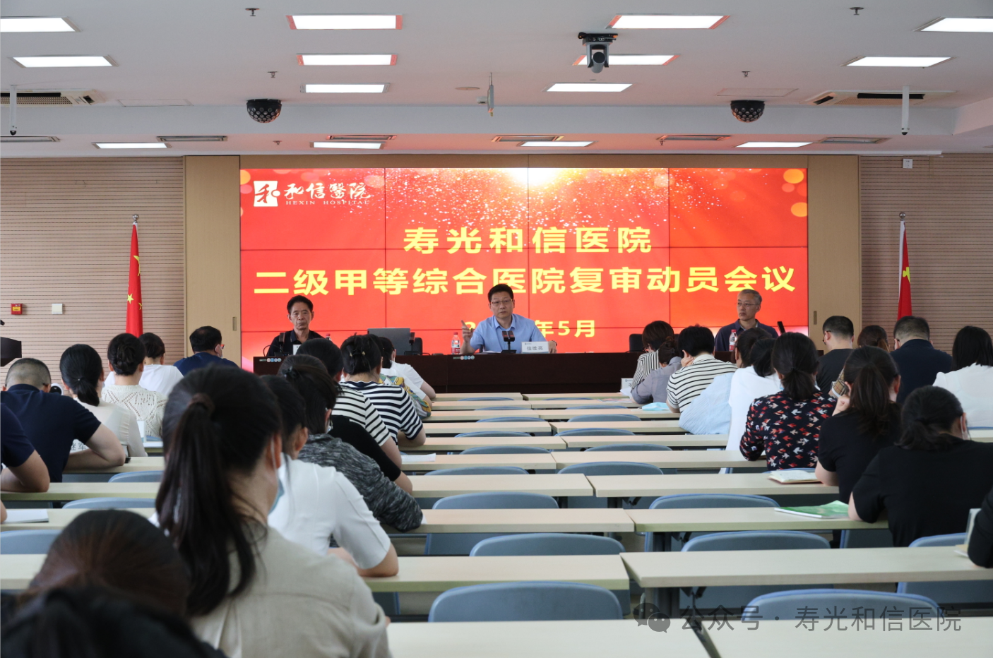 5月17日,寿光和信医院召开二级甲等综合医院复审动员大会,进一步全院动员、全面部署、全力推进二级甲等医院复审工作。医院党总支书记、院长信维亮,副院长刘伟光,顾问梁汉武出席会议。各科室负责人、护士长、评审联络员及行管科室全体员工参加了会议。会议由医院党总支副书记李连卫主持。