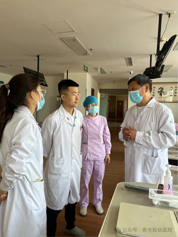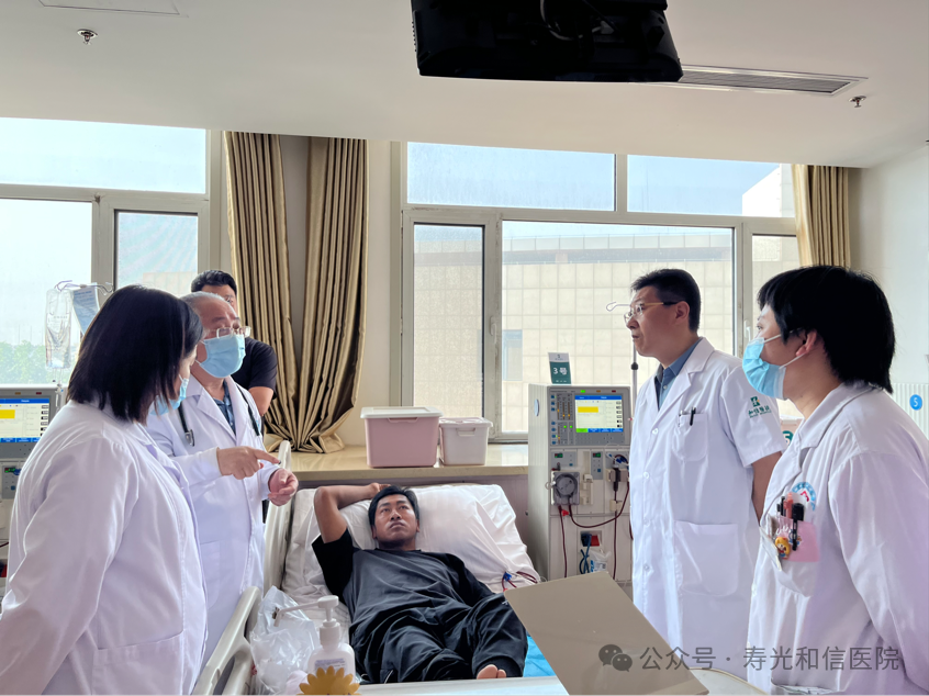 5月14日,寿光和信医院书记信维亮院长与潍坊益都中心医院肾内科杨焕荣主任医师在血液透析室联合查房,信维亮院长结合中国台湾透析理念与杨焕荣主任医师查房并慰问透析患者。