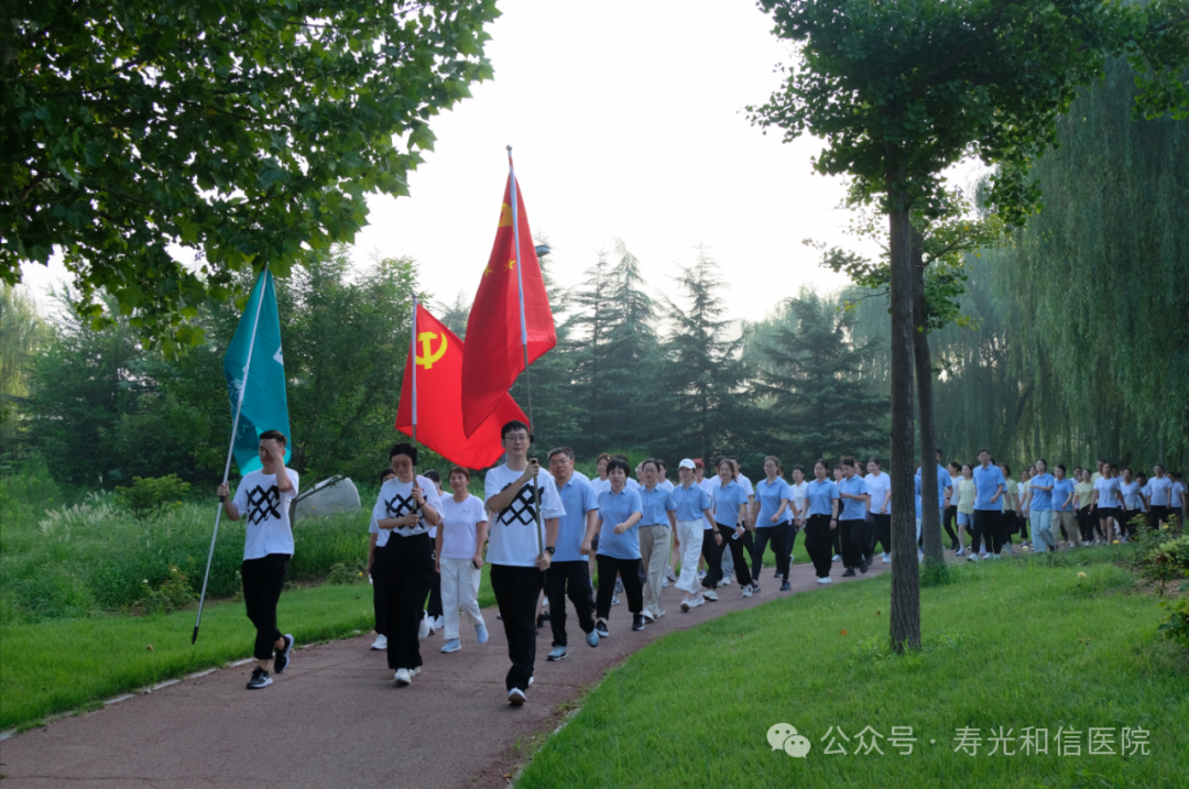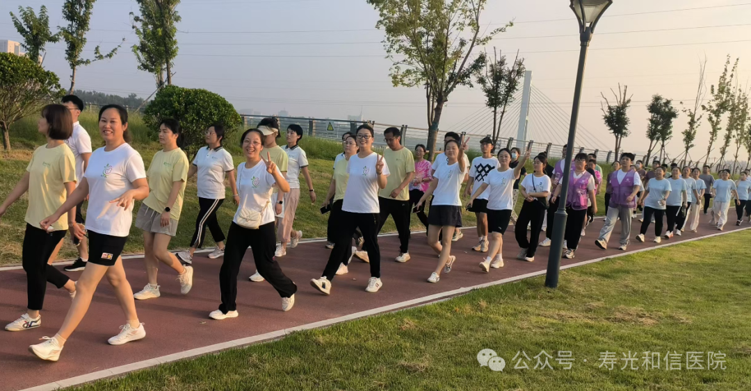 6时5分,随着信维亮院长手中的发令枪响,大家踏上了快乐徒步之旅。各科室成员统一各自的着装,沿着河岸阔步前行,形成一道亮丽的风景线。尽管烈日炎炎,但大家精神饱满、热情高涨,一路上,相互鼓劲,你追我赶,时不时驻足合影,留住美好瞬间。大家在挥汗如雨的坚持中磨练了意志,强健了体魄,更增进了友谊,纷纷表示,要加强锻炼,体能练好了才能更好地服务患者。