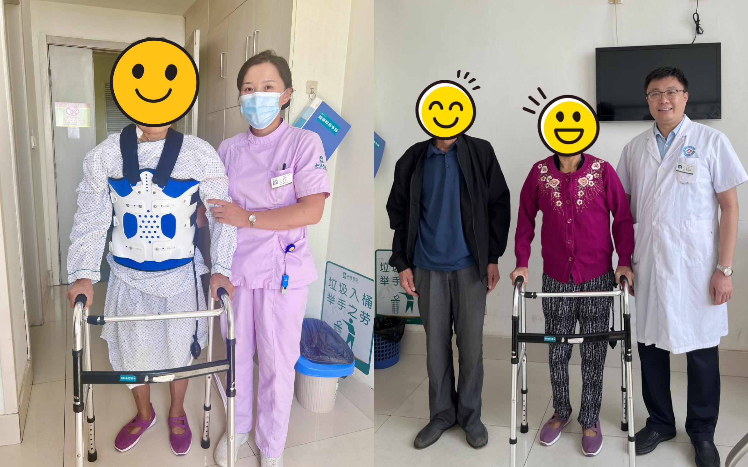 术后患者肢体活动正常,没有神经受损的情况。经历了前几天的发热,血糖不稳定,低蛋白血症,离子紊乱等并发症,逐渐各项指标都调整正常了。术后第7天,引流管拔除后,桑大姐佩戴支具顺利地下床活动,原来剧烈的腰腿疼症状消失了,她非常高兴,并且打趣说,不但腰杆直了,还比原来高了4、5公分。她爽朗的笑声是对治疗效果最好的回答。