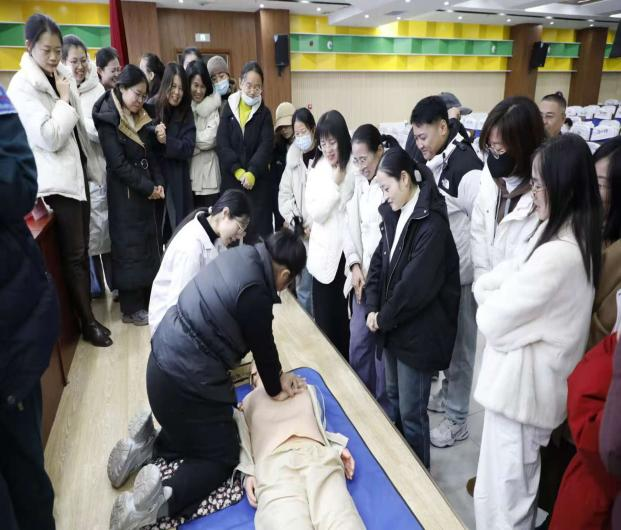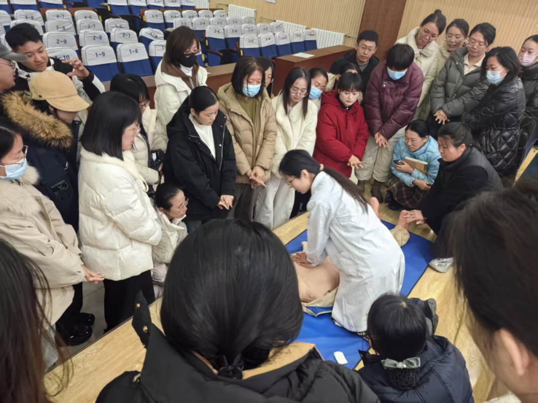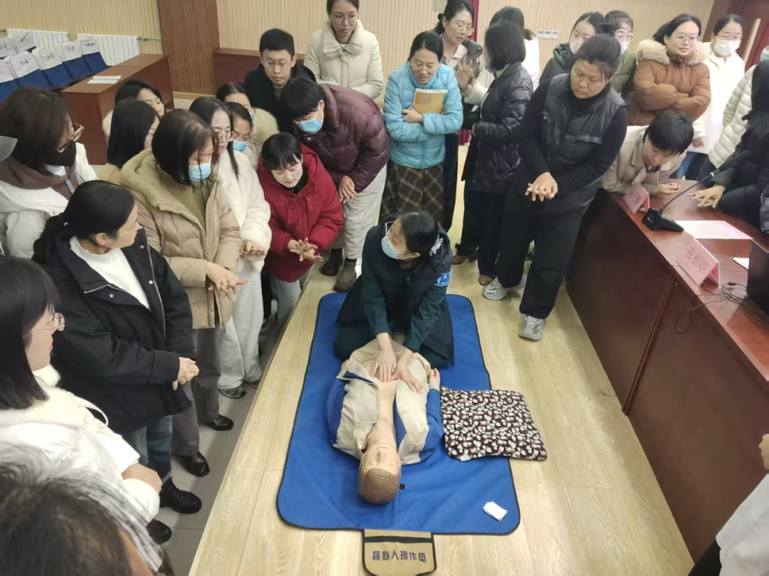 来自和信医院急诊科的3名医护人员化身“急救导师”,通过理论讲解、情景模拟、实操演练等多种形式,为全校200余名教职工带来了一场专业而实用的急救知识培训。现场气氛热烈,教职工们在医护人员的专业指导下,积极利用模拟人练习胸外按压和人工呼吸,并亲手体验了“海姆立克急救法”。