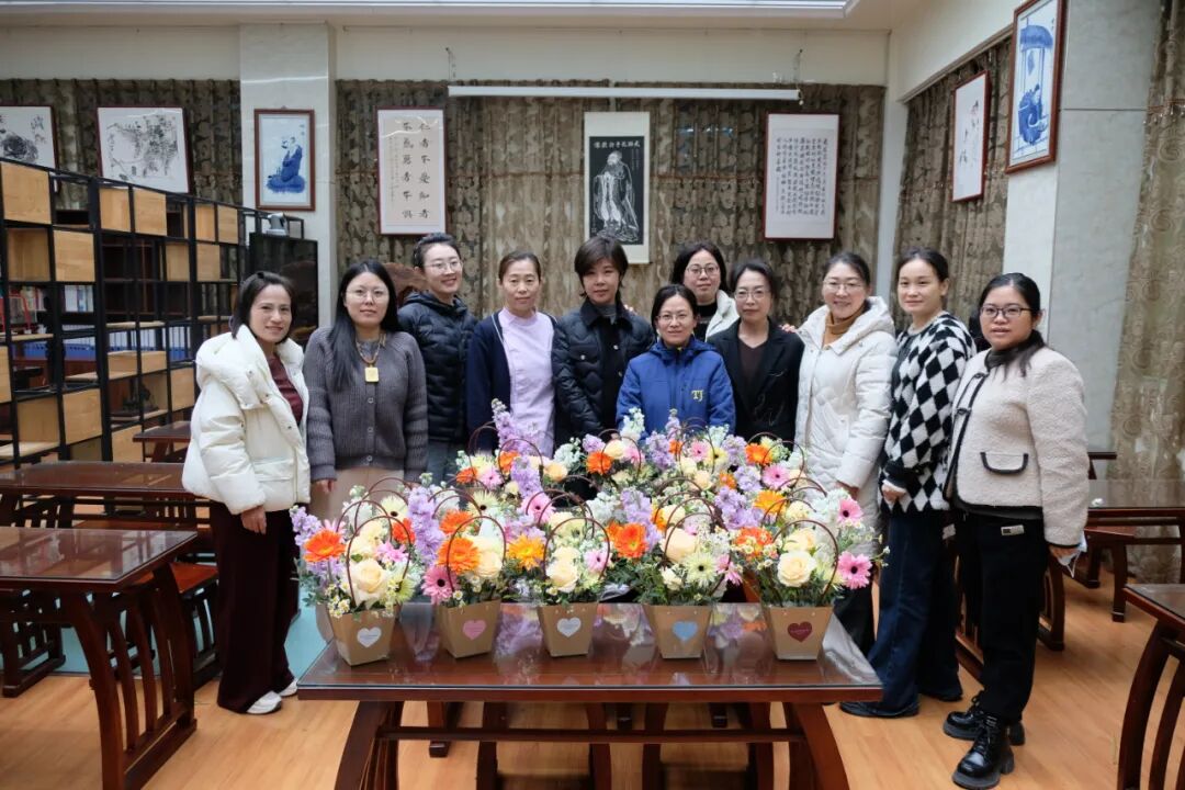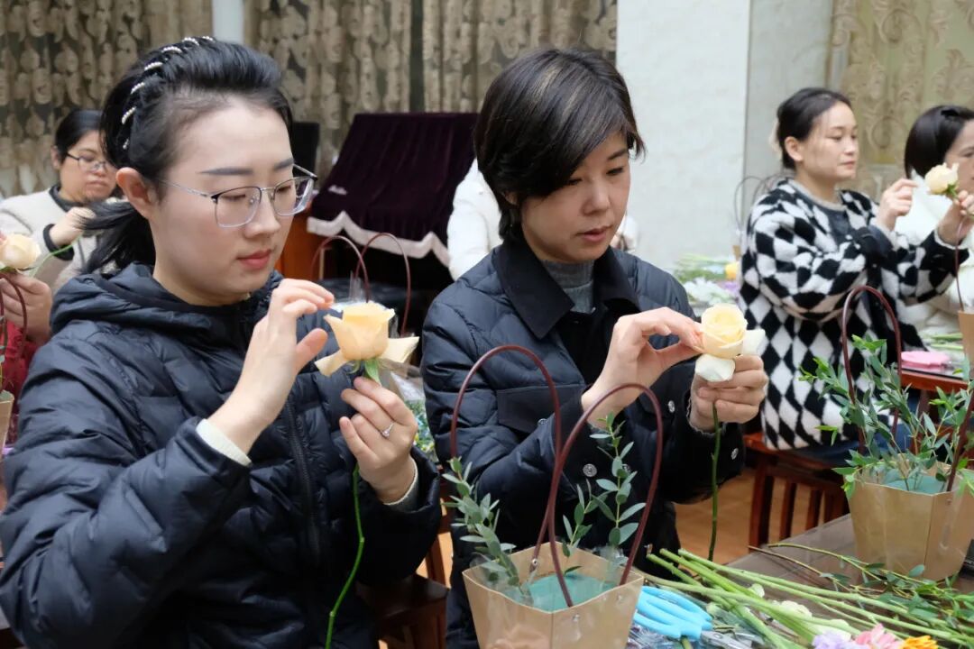 活动现场花香四溢、暖意融融,成串的紫罗兰缀满枝头,非洲菊热烈明艳,月季娇艳欲滴,康乃馨温柔雅致,小雏菊清新灵动,精心筹备的每一种花材都承载着对女神们的美好祝福,为活动增添了浓浓的节日氛围。大家围坐在一起,指尖萦绕着花香,脸上洋溢着期待,迫不及待地开启这场花艺创作之旅。