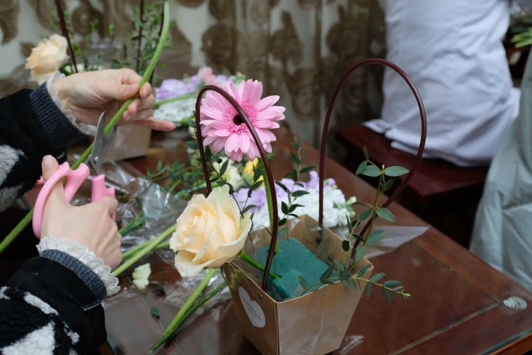 讲解结束后,插花创作正式开始。大家纷纷拿起花材,剪枝、修叶、插花,沉浸式投入到属于自己的花艺创作中。看似简单的操作,实际动手起来却充满挑战。有员工坦言,刚开始时格外小心翼翼,搭建框架时不敢多用花枝,修剪花材时也迟迟不敢下剪,插出的花篮显得单薄空旷;后来借鉴同事的创作经验,大胆裁掉过长的花枝,让花束变得饱满,却又因过于密集失去美感。就在自己一筹莫展之际,插花师逐一巡视指导,轻轻将其中一枝花后移调整,原本略显杂乱的花篮瞬间变得既饱满又舒朗,错落有致的花型尽显雅致韵味。